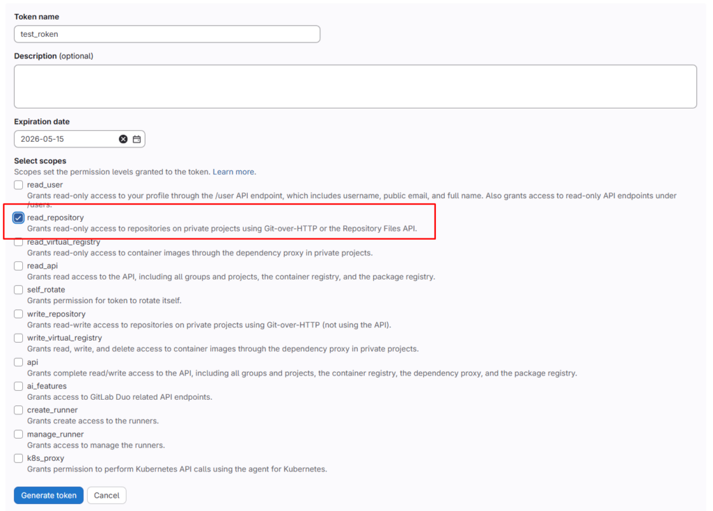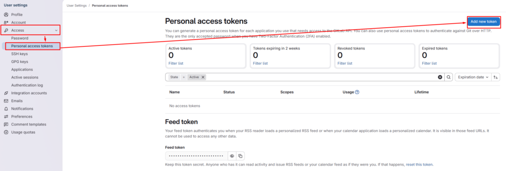 Готово! У нас есть готовый репозиторий и плейбук. Теперь нам надо настроить персональный токен доступа (PAT). Переходим в свой профиль gitlab и идем в Профиль — Edit profile — Access — Personal access tokens — add new token.