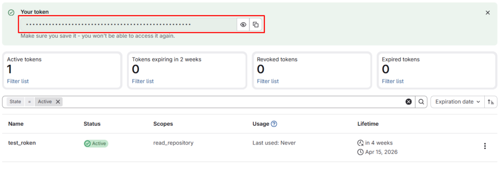 После генерации токена, необходимо скопировать его. Он покажется только один раз!