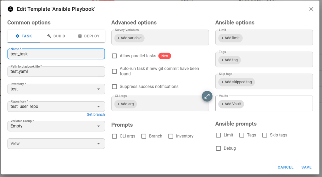 Далее идем в задачи и создаем нашу задачу. Собственно указываем имя нашего плейбука, выбираем репозиторий, инвентори и т.д. (настройки задач это уже другая история…)